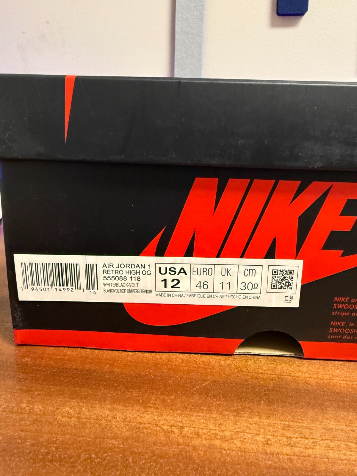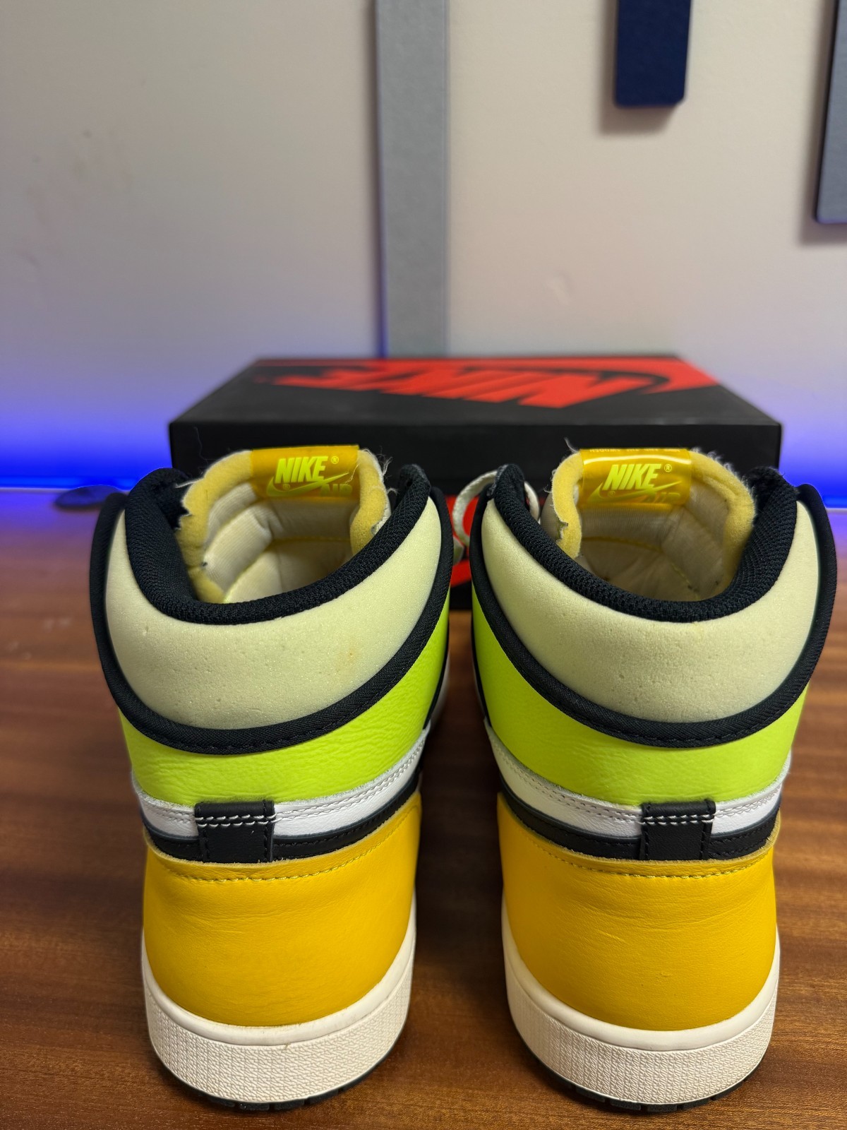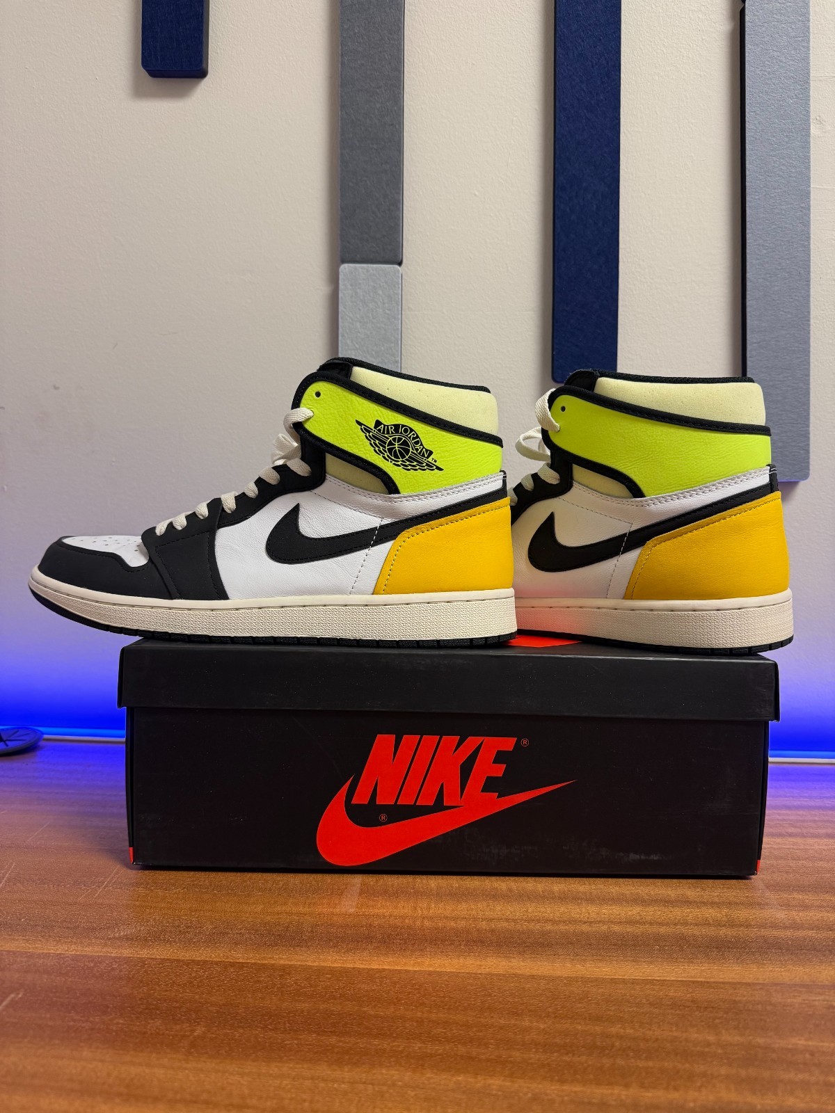 Really great condition — worn only a couple of times. Zero major creasing, no scuffs, super clean inside and out. Comes with original box. These are the Volt colorway with the white leather upper, black overlays, and bright volt details — perfect for anyone who wants a standout pair of 1s.