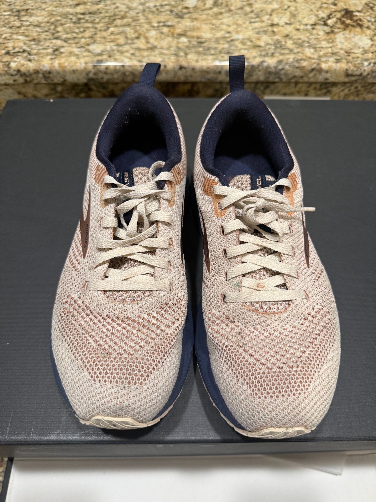Brooks Revel 5 running shoes. Women’s size 8. Neutral cushion with a breathable knit upper in a tan/rose gold and navy colorway. Lightweight and great for everyday runs, walking, or all-day comfort.