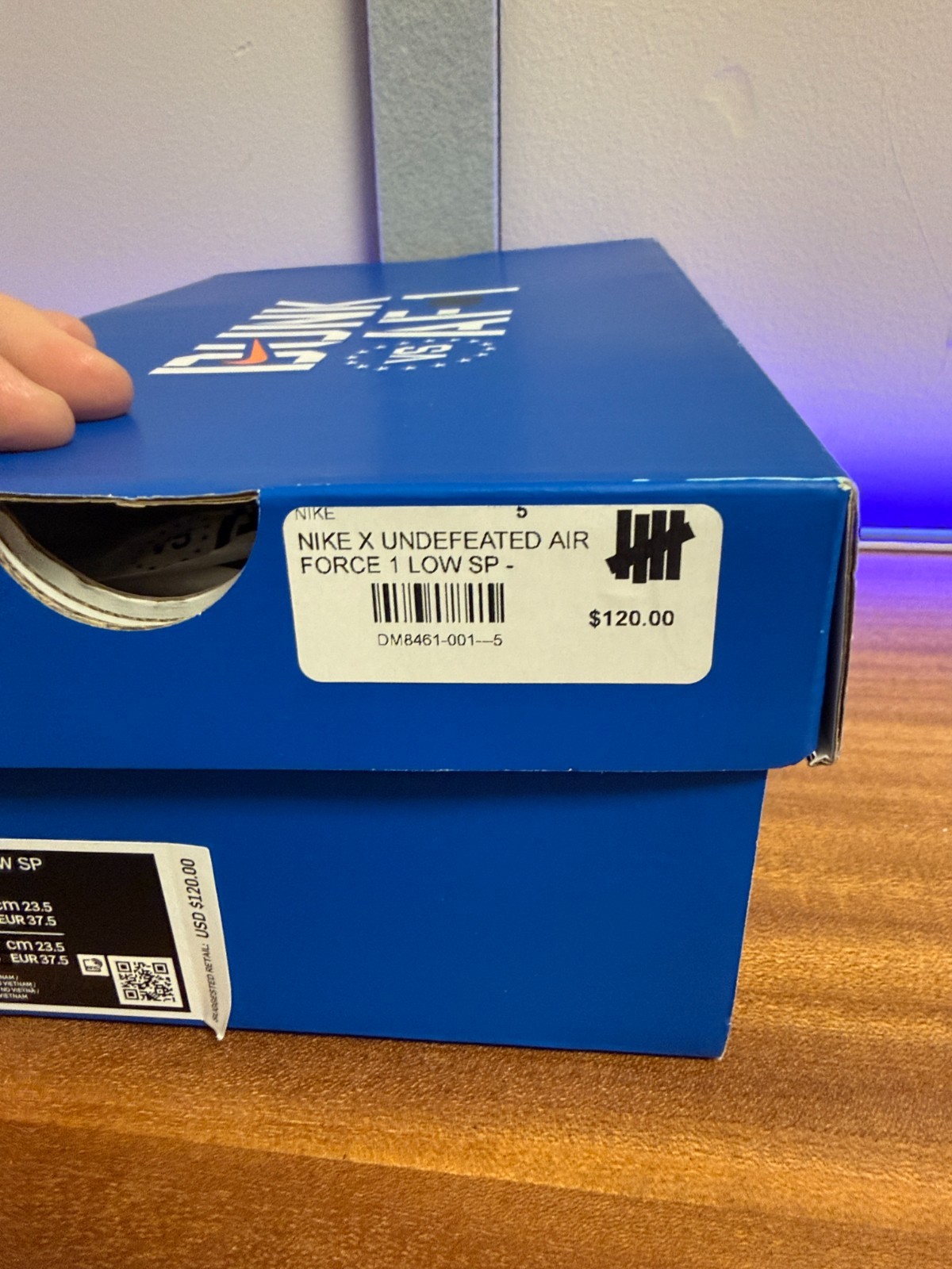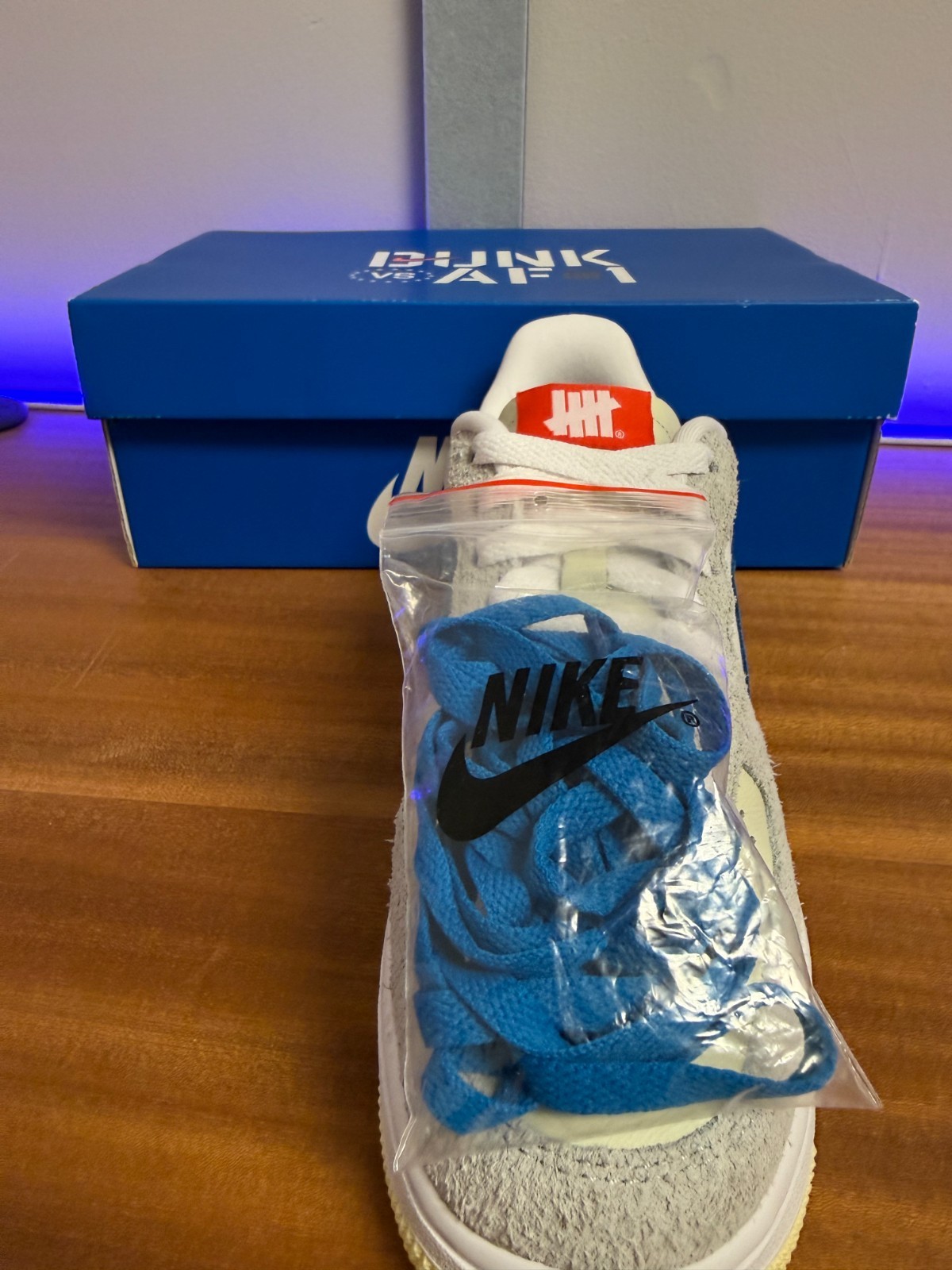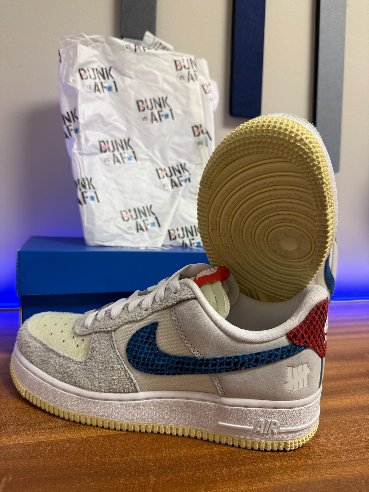 This is the “5 On It” collab with Undefeated featuring the textured suede, cream leather, and the snakeskin-style blue swoosh with the red heel detail. Really unique materials and color combo — not something you see every day.